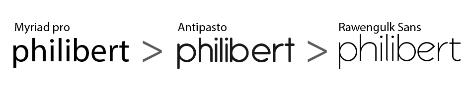 Pour la police, je n’ai pas voulu scinder l’enseigne en gardant Philibert intact. Utilisation d’une police Antique). Affinement de la graisse (Myriad pro, Antipasto, Rawengulk Sans). P minuscule pour garder la ligne fine.
