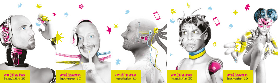 Pour «Imagine Improvisation 3.0», j’ai composé avec des couleurs acidulées fortes et un design assez minimaliste. Typographie antique fine et élégante ‘Century Gothic’ pour les titres. Typographie ‘arial’ que j’ai déstructuré sur Photoshop puis vectorisé32 pour le logo.
