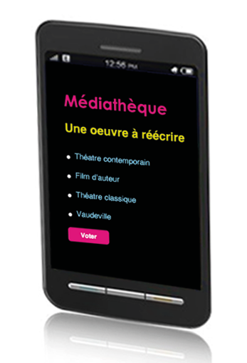 MEDIATHEQUE : D’après une œuvre littéraire, les répliques d’un seul personnage sont projetées, un cobaye les lit et les interprète. L’autre invente les répliques cachées.