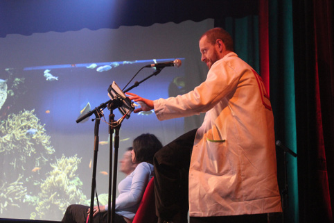 CONFERENCE TED : Une présentation est projetée, le cobaye conférencier découvre les diapos.