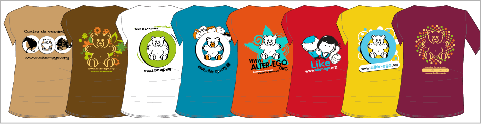 Depuis 10 ans, je crée pour chaque saison un T-shirt générique. Le visuel change en fonction de la charte en vigueur. Le seul élément clé est le logo et le texte communiquant sur www.alter-ego.org. Au cours des années, nous avons eu écho de l’attachement certain au nounours. Ce dernier trouve une grande place ces dernières saisons.